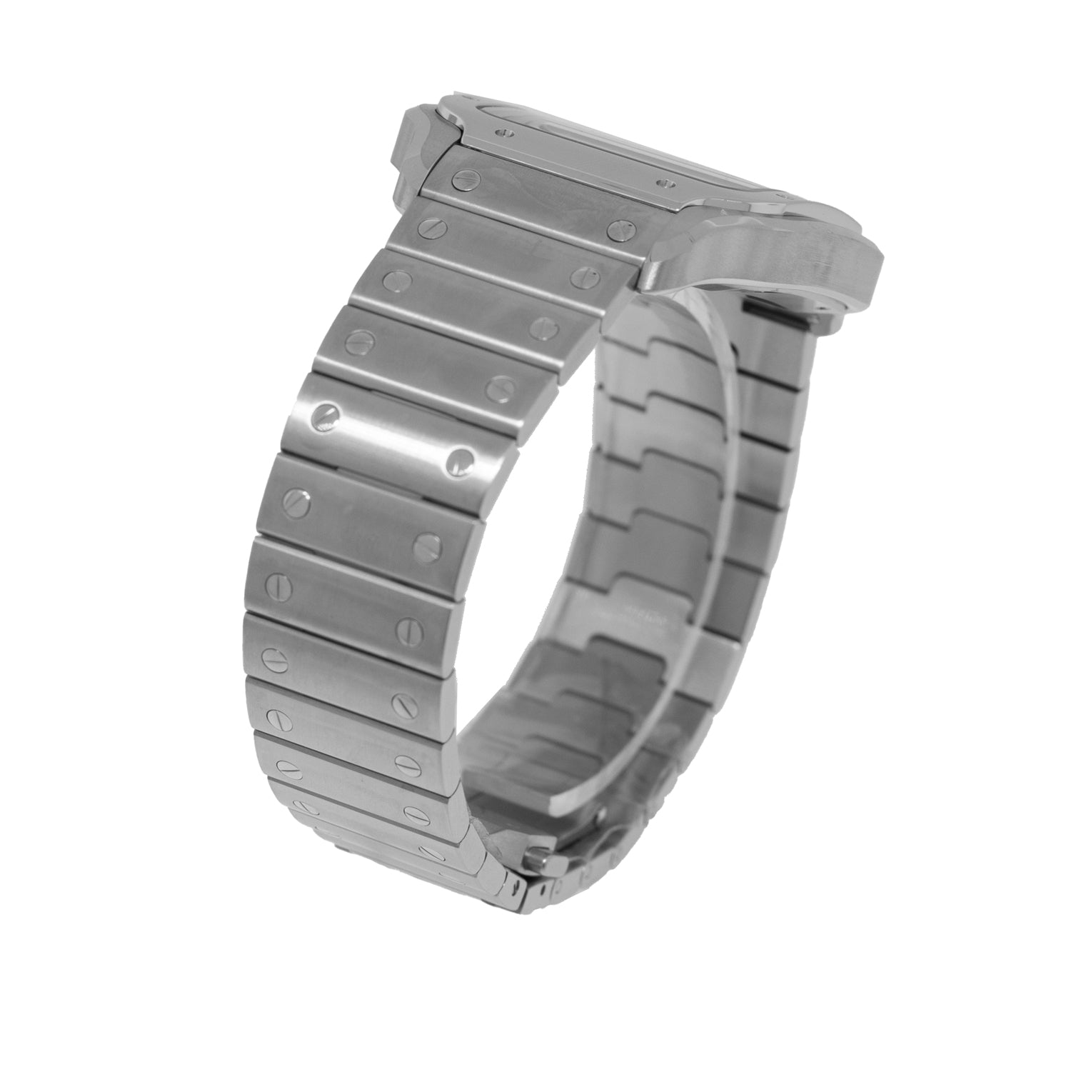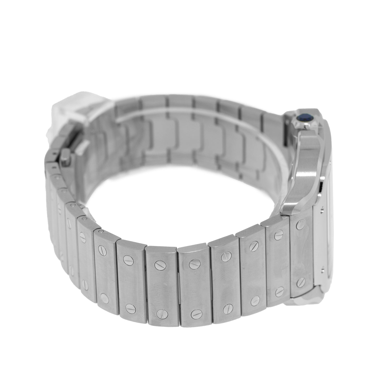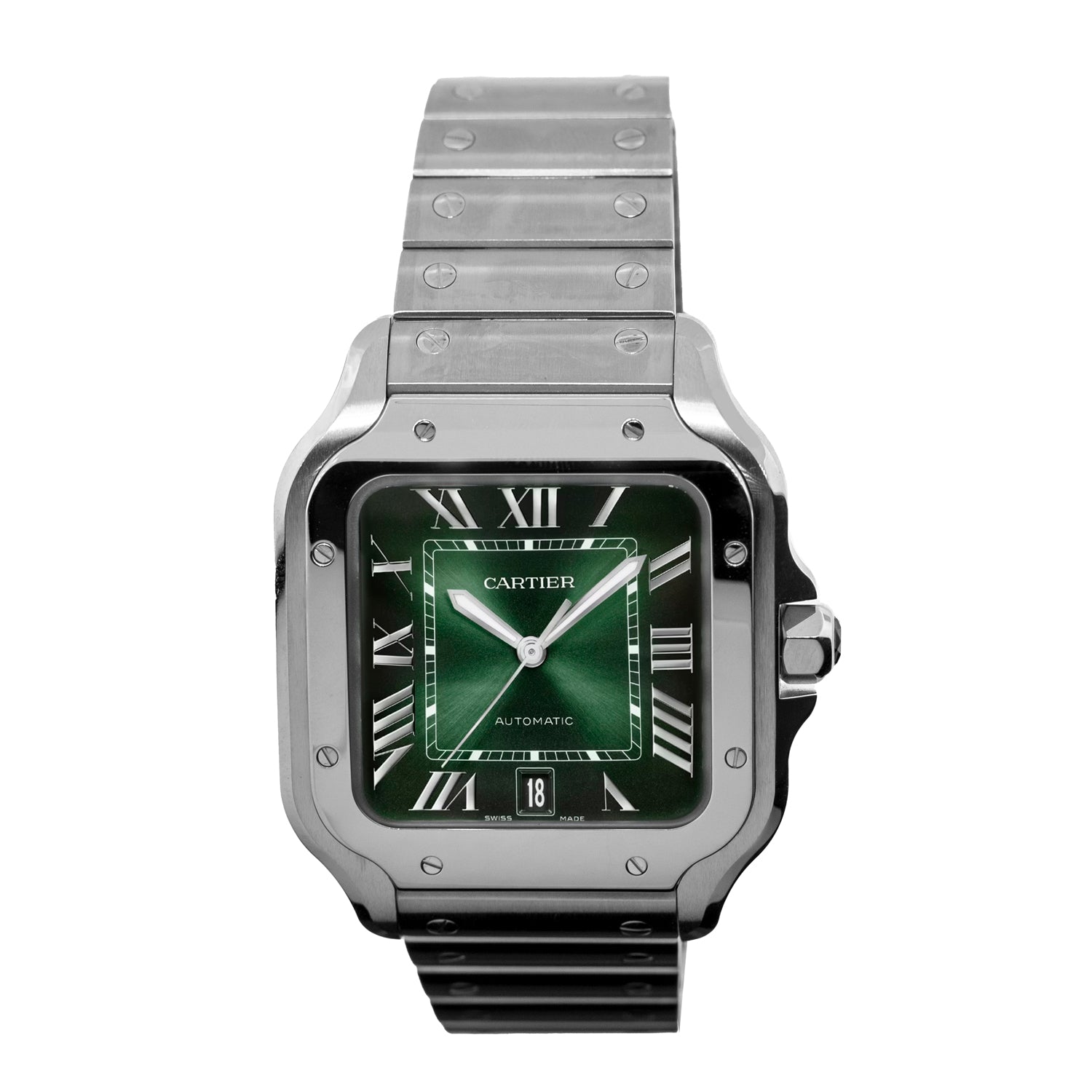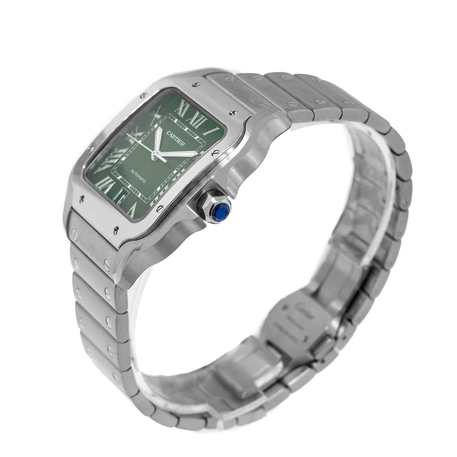 Brand-New Men’ Cartier Santos Collection with a 40mm stainless steel case. This fine timepiece is brand-new and features a Green dial with Roman numerals, mechanical movement, and a stainless steel bracelet, comes with extra green leather strap. The watch is brand new, fully stickered, factory sealed.